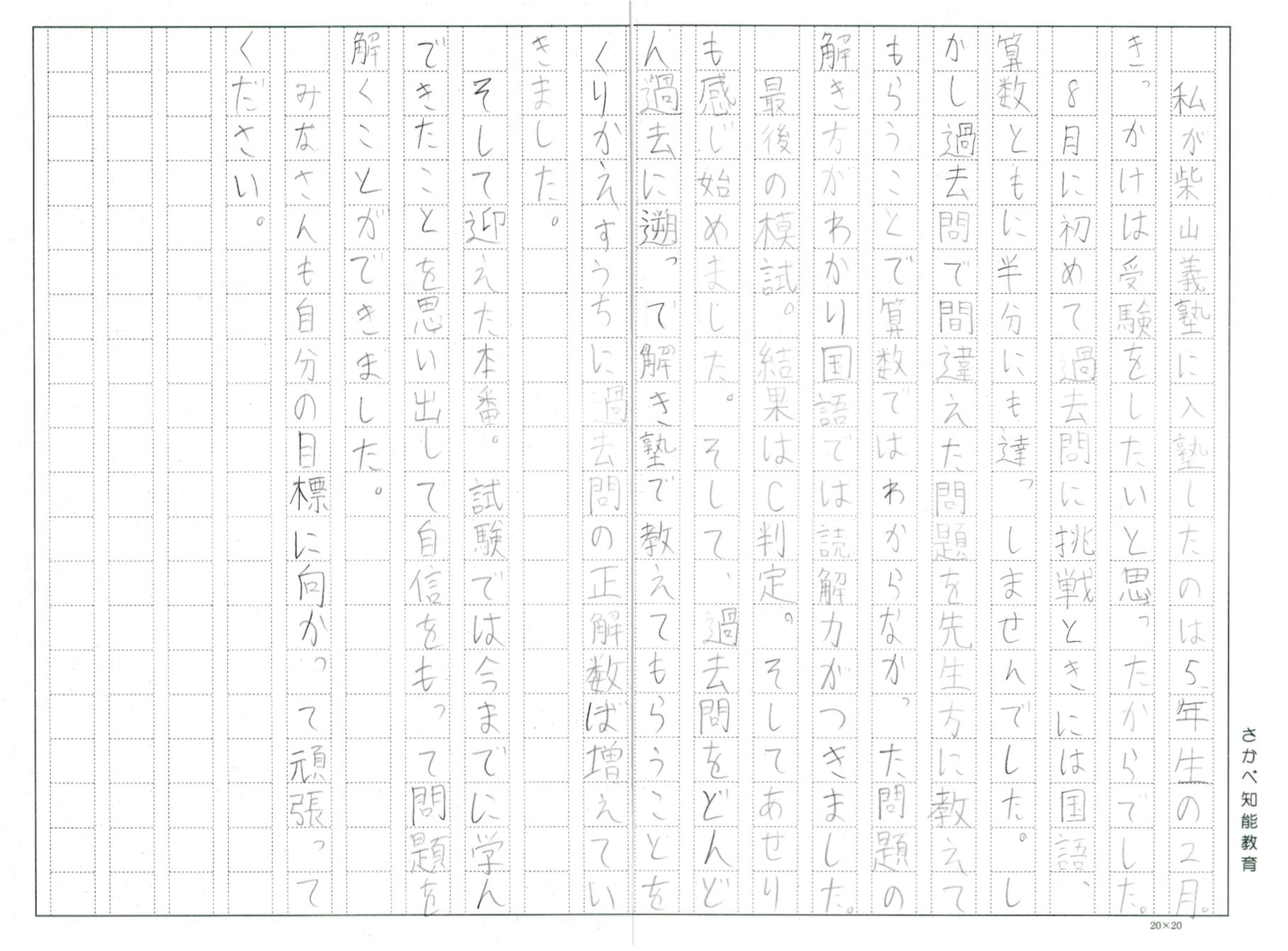 受験勉強を通して大きく成長した姿や、日々の努力の積み重ね、そして合格に至るまでの歩みが率直な言葉で綴られています。