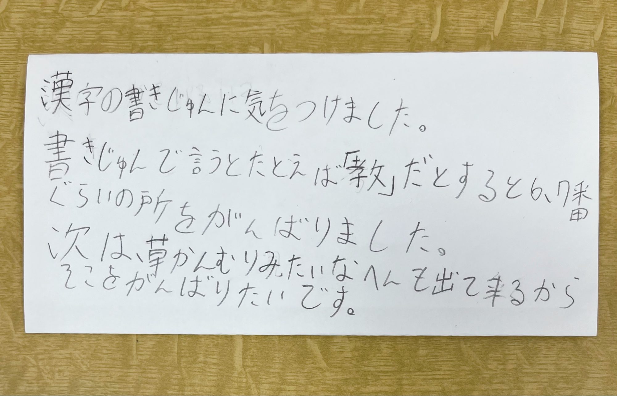 書きじゅんで言うとたとえば「教」だとすると、6・7番くらいのところをがんばりました。
